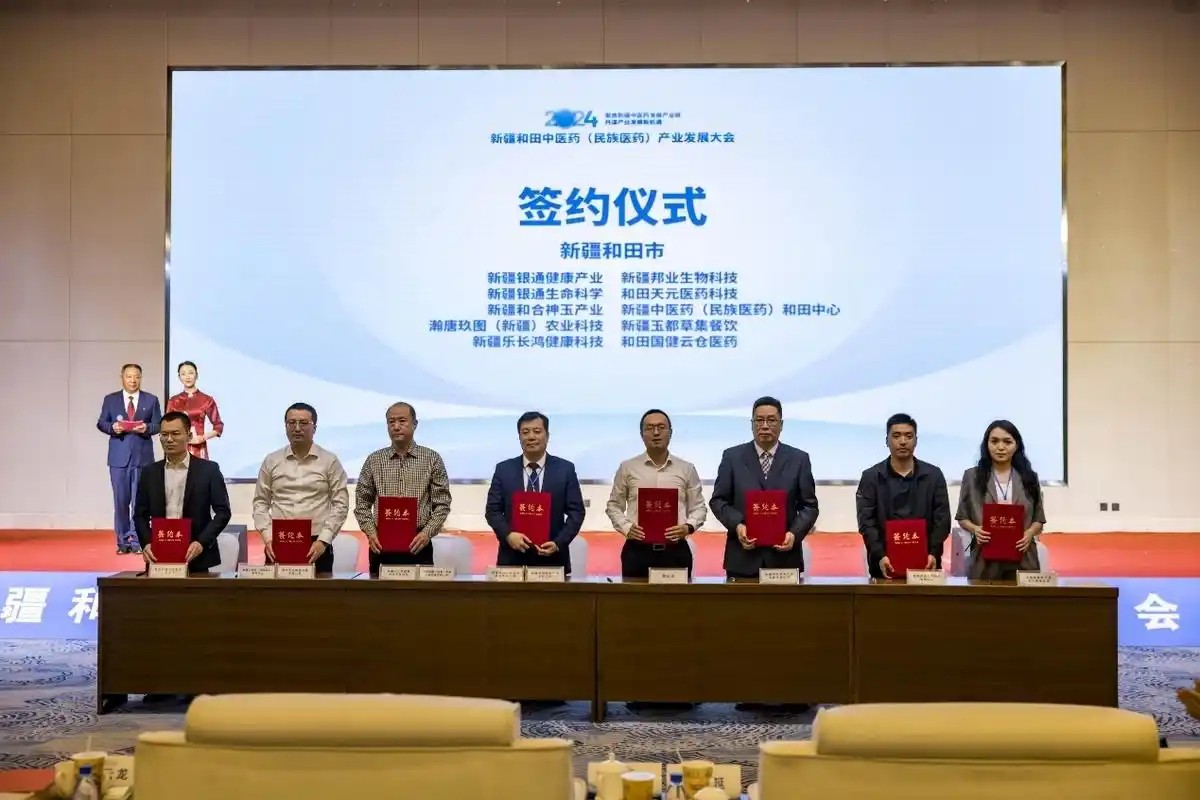 民族医药是我国重要的卫生资源、优秀的文化资源、潜在的经济资源和具有原创优势的科技资源。会议当天,和田市与安徽省亳州市谯城区、无锡太湖国家旅游度假区管委会、连云港市经开区围绕中医药产业发展深度合作签订框架合作协议;于田县与北京大学中医药现代研究中心签订共建于田县肉苁蓉研究中心合作协议;和田市、于田县分别与疆内部分中医药企业签约,达成合作意向;和田市与安徽省中医药大学举行了合作开设维吾尔中医门诊揭牌仪式。在未来,还将承担起示范引领、药材种植专业培训基地的作用,同时和田地区运用“互联网+”、大数据等现代技术手段构建“研、培、产、供、销”等一体化商贸体系,造福和田百姓,带动药农增产增收。